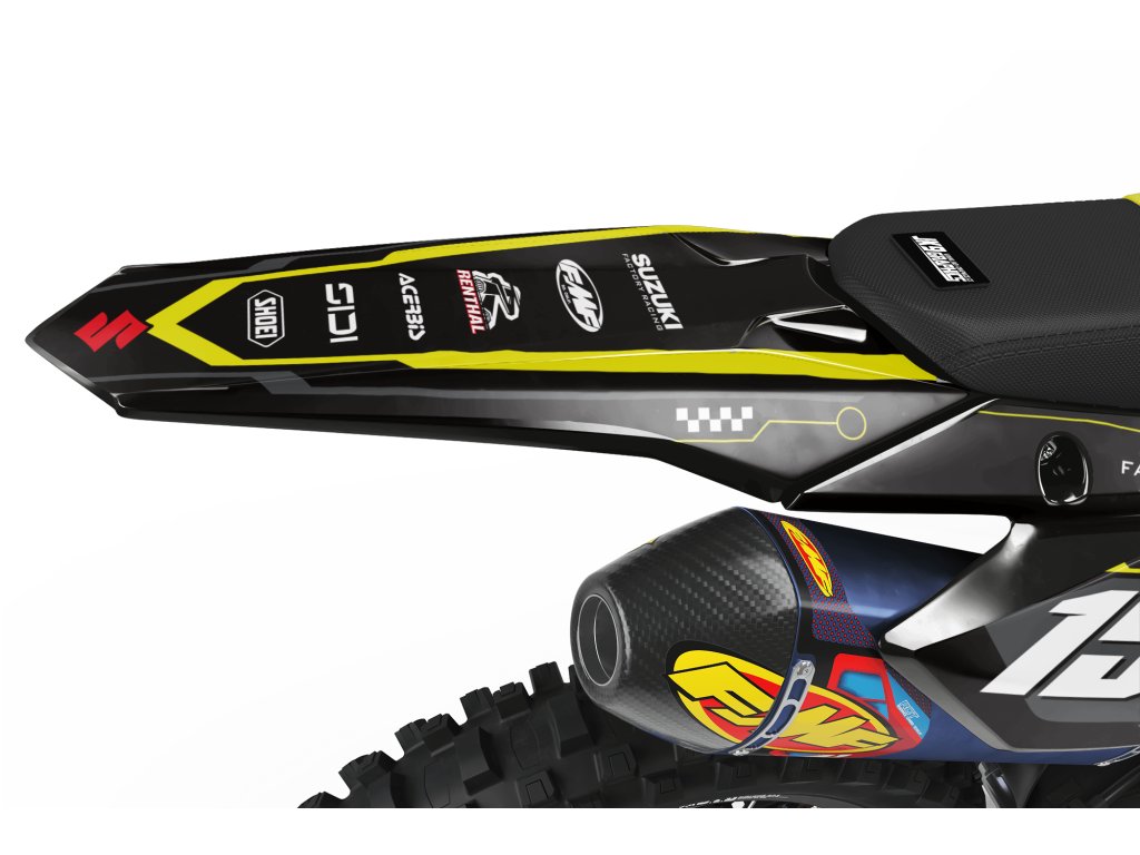 Shrouds / Tank, Side number plates, Airbox, Rear fender, Front fender, Front number plate, Fork guards, and Swingarm.