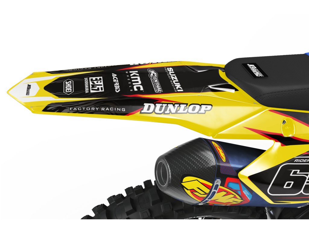 Shrouds / Tank, Side number plates, Airbox, Rear fender, Front fender, Front number plate, Fork guards, and Swingarm.